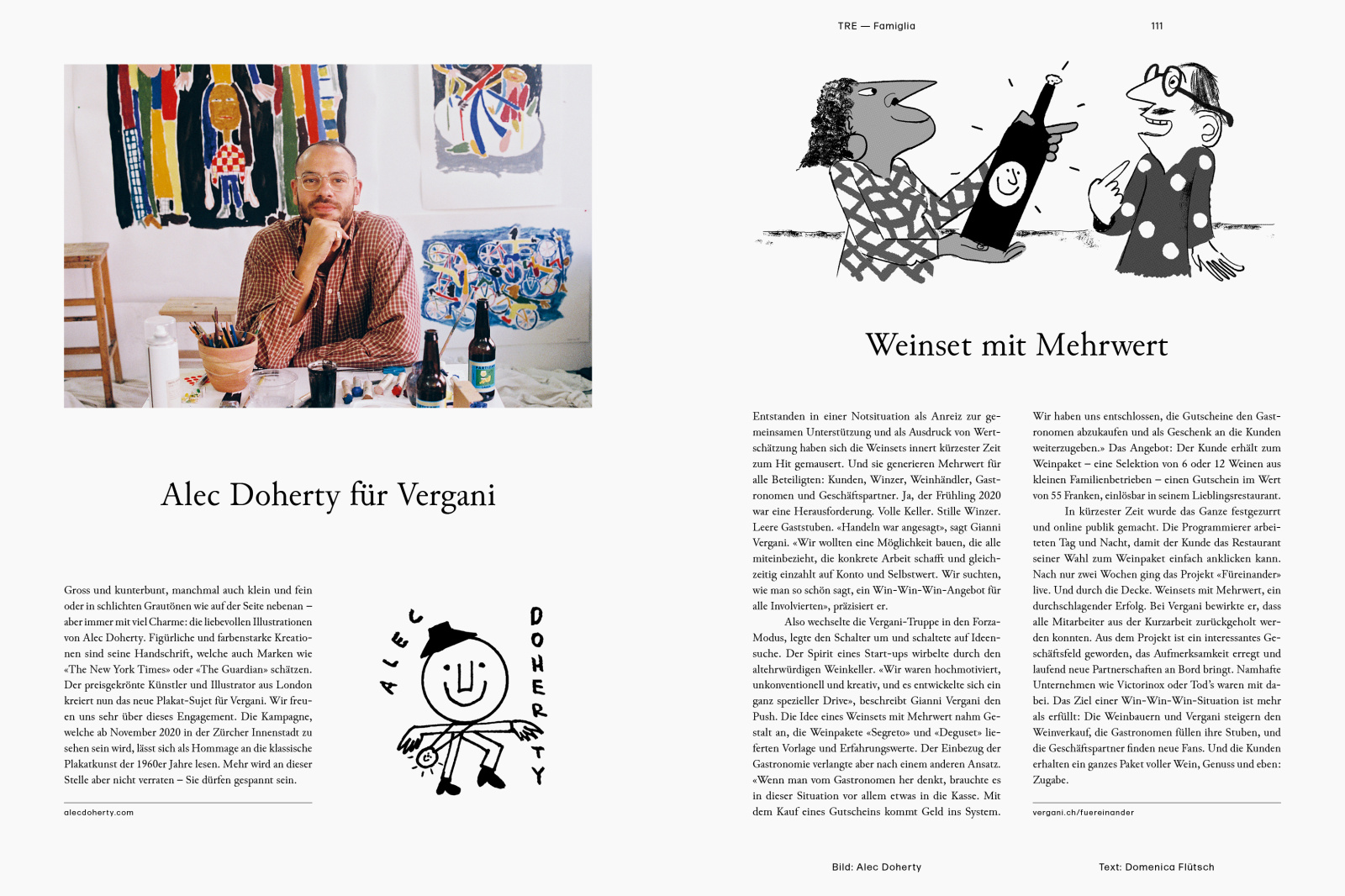 Stories of friends and hosts, of artisans and vintners, and not in the least, of the family itself: the Vergani Magazine. The new edition celebrates the enjoyment of life according to the motto “Vino e vita”, with its source coming from, among others, a collaboration with the gastro-journalist Andrin Willi, photographers TorviolL Jashari, Simon Habegger and Douglas Mandry as well as the illustrator Alec Doherty, who created the subject for our campaign.